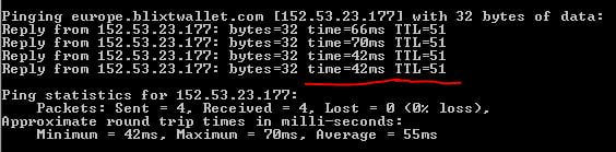 This is an usual ping to the neutrino server europe.blixtwallet.com, this shows that the connection is very good with a response time of avg 50ms and a TTL of 51. The response time can vary but not too much. TTL must be stable.